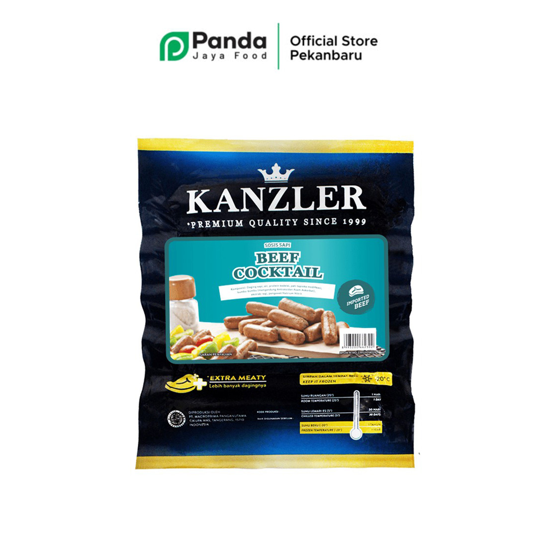 SOSIS KANZLER BEEF COCKTAIL 500 Gram Sosis yang terbuat dari daging premium yang dicincang halus dengan ukuran lebih kecil. Dibuat dengan metode pengasapan, pengeringan dan pemasakan dengan uap. Tanpa menggunakan MSG dan bahan pewarna.