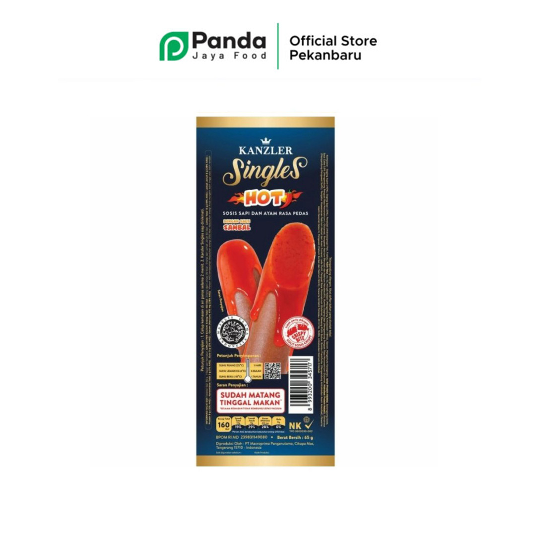 Kanzler Singles Hot Sosis matang siap makan dengan cincangan daging premium dan bumbu yang halus, dengan tambahan saus pedas. Dibuat dengan metode pengasapan, pengeringan dan pemasakan dengan uap. Tanpa menggunakan MSG dan bahan pewarna.