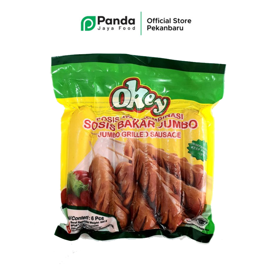 Okey Sosis Bakar Jumbo 500 gram, Sosis daging sapi berukuran jumbo yang cocok untuk jadi teman bakar-bakaran atau nge-grill bareng keluarga.